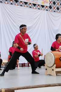 私たちは大阪は住之江区の住吉川小学校の和太鼓集団「絆」です。結成は4年目でいつも楽しく練習しています。今日は4曲を心を込めて演奏しますのでよろしくお願いします。もちつき太鼓三宅(みあけ)華光(はなあかり)楽心(らっこ)
